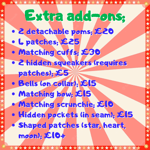 You will be able to choose from a selection of trims (poms, lace or ric rac) but colours are subject to availability. You will also have the opportunity to purchase more add-ons should you wish! (See "add-on" slide for options and prices) I will send out a Google form for you to complete within a day after purchase, please keep an eye out for this in your emails!
