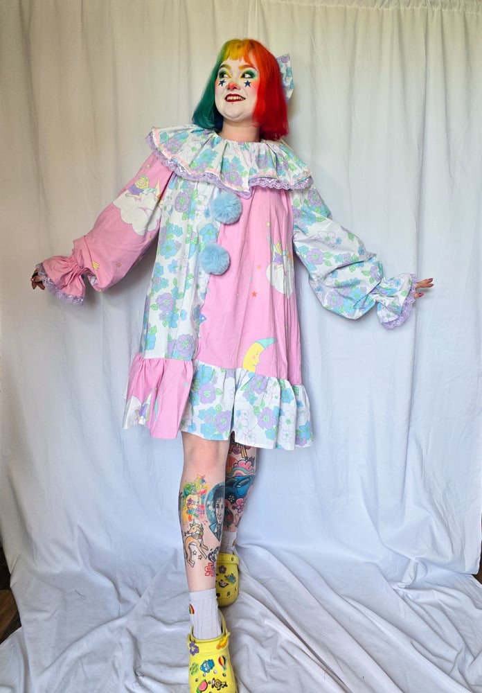 Fairy clown dress set with matching collar and bow! Size M but can fit a range of sizes. With ric rac and lace trim, detachable poms and matching bow. Made with second hand materials.